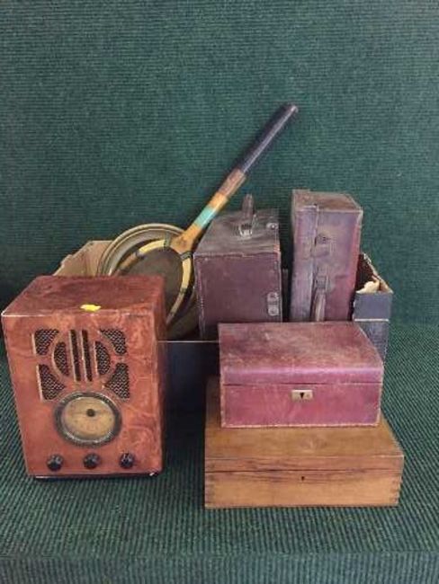 A box of leather trinket boxes, leather cases, walnut box, vintage style radio etc