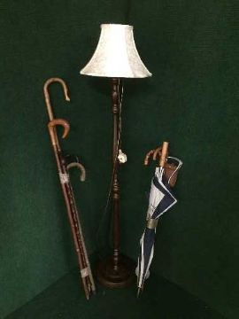 Two bundles of walking sticks, shooting stick, standard lamp with shade