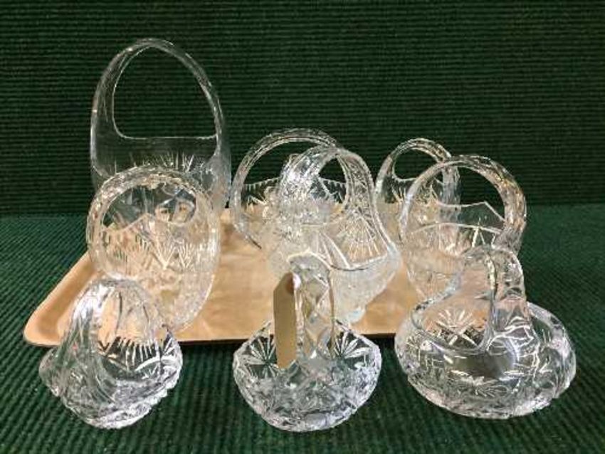 A tray of ten lead crystal baskets, various sizes.