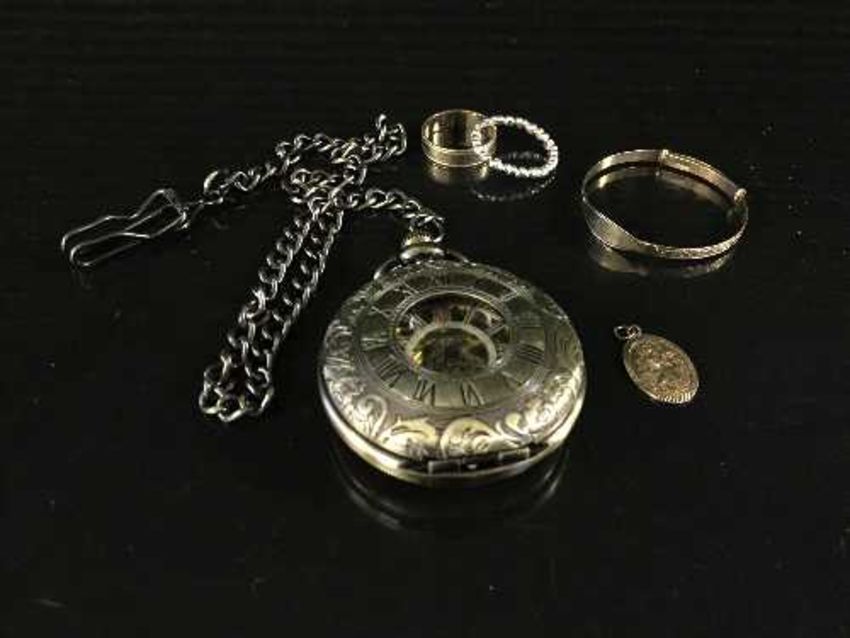 A 9ct gold band ring together with a small gold bangle, yellow metal charm, pocket watch on chain etc.