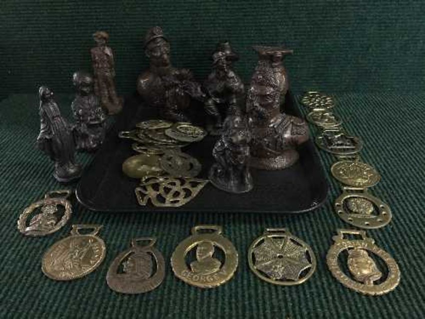 A tray of assorted horse brasses, Errington Hand cast sculptures etc