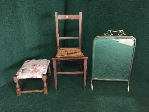 A brass framed mirrored fire screen together with an inlaid mahogany hall chair and stool