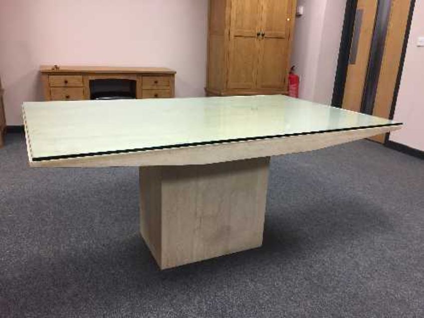 A marble dining table with plate glass top