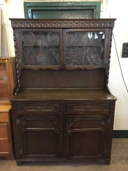 A carved oak kitchen dresser with leaded glass doors