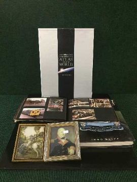 A crate containing an interesting selection of loose cigarette cards, five albums of cigarette cards, railway pamphlets, Times Atlas, three albums of train photographs, Mercedes Benz book, prints, etc. (Q)