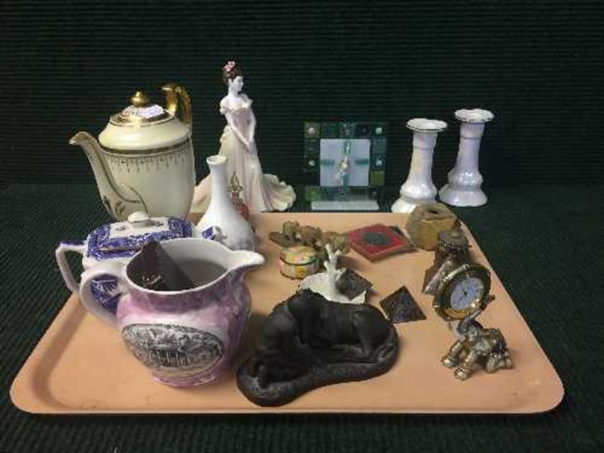 A tray of Copeland bone china coffee pot, Coalport figurine Four Seasons of Summer, commemorative coins, Sunderland jug etc.
