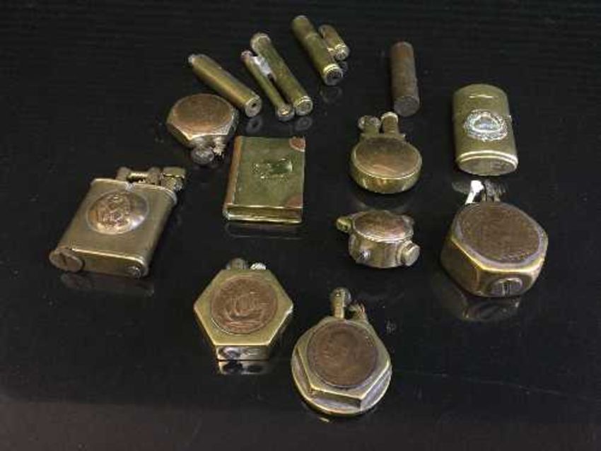 A tray of assorted copper and brass lighters