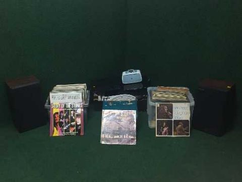 Two boxes and a case of lps, pair of Sharp speakers, LCD tv, Sony Turn table, technics tuner etc.