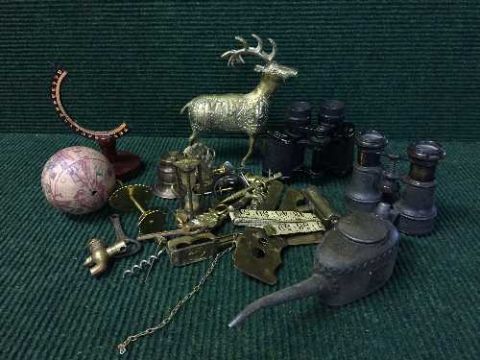 A tray of field glasses, assorted brass including ornaments, gavel, bottle openers, vintage Kayes oil can etc.