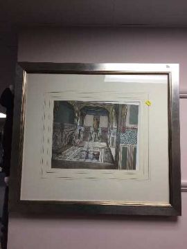 A set of three colour prints depicting Persian palace interiors in comtemporary frames.