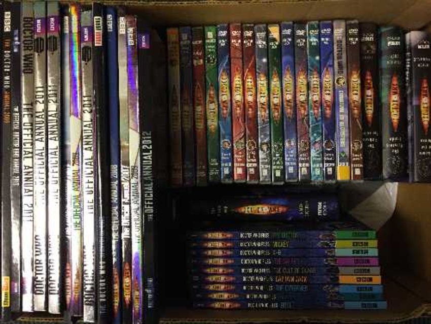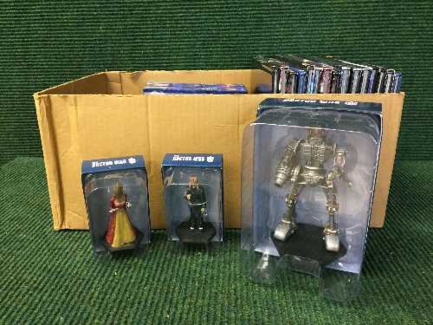 A box of quantity of books, dvds and figurines all relating to Dr Who