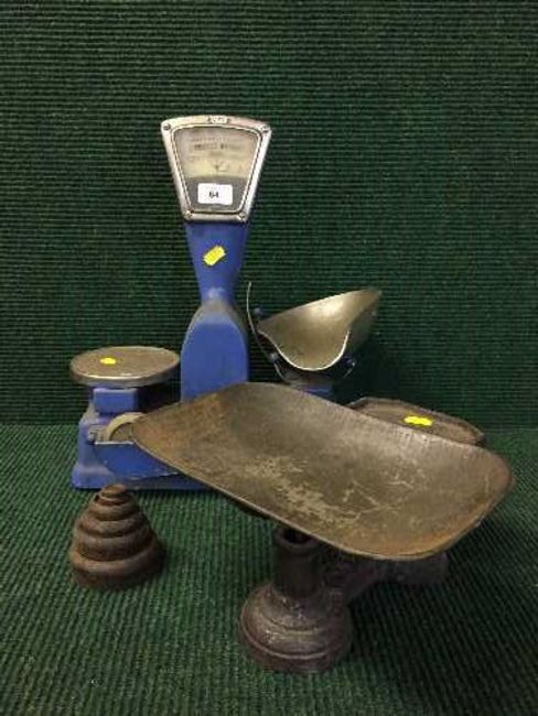 A set of Vandome and Hart weighing scales, with weights and a set of kitchen scales with weights