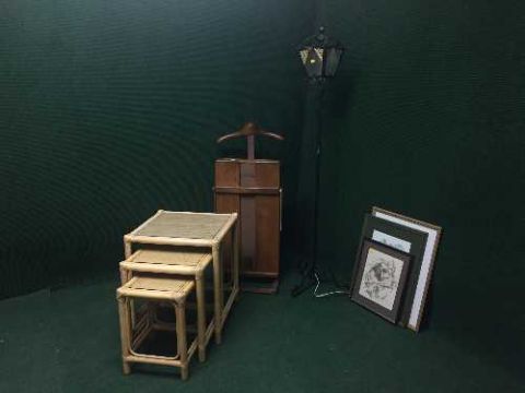 A nest of three bamboo and glass topped tables, metal street lamp standard lamp, valet stand and three prints