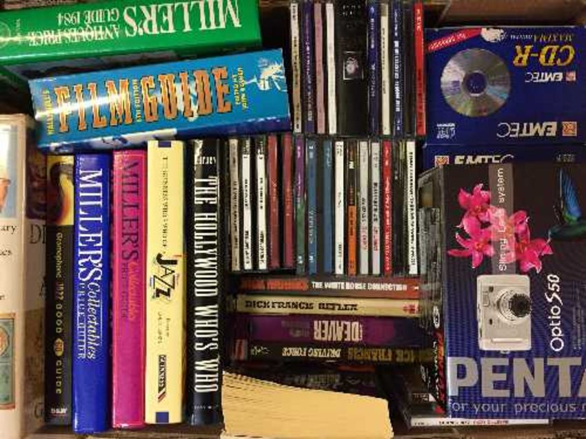 Two boxes of reel to reel player, Toshiba dvd player, digital camera, books, antique references, cds etc.
