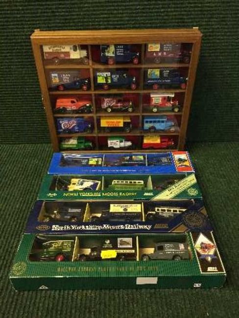 Four boxed Lledo triple pack die cast delivery vehicles and buses, together with a small glass fronted display case containing fifteen further vehicles