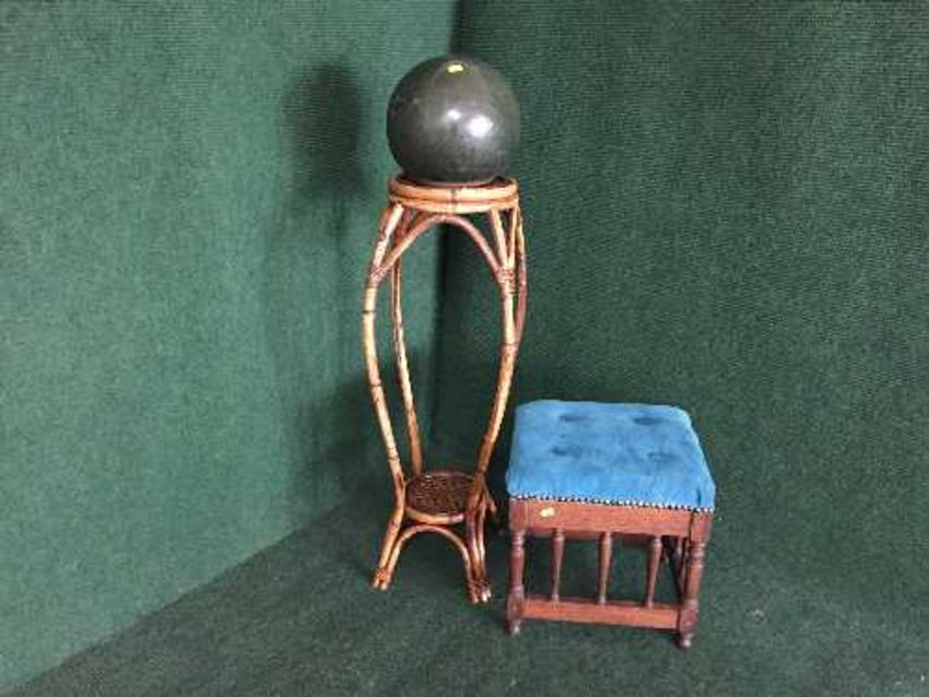 An Edwardian oak footstool, bamboo plant stand and a ceramic ball