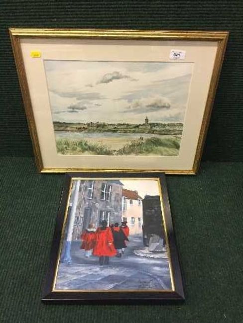 A framed oil on canvas - figures in school dress by Margaret McIntyre, dated 78 and a watercolour - coastal landscape initialled C.K.W. dated 1984