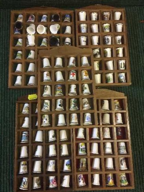 Five racks of china thimbles and four boxed Spode plates