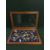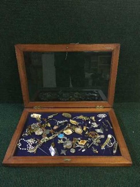 A glazed oak table top jewellery cabinet containing a quantity of costume jewellery, silver sugar tongs, ship's whistle, Defence medal etc (Q)