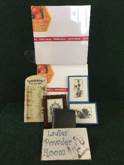A novelty "Household-Reminder" wall-mounted shopping chart, together with a "Lady's Powder Room" metal sign, two Reeves twin packs of blank artist's canvases, a photo album, a pair of woodcut prints depicting flowers (in blue frames) and seven photo frames (various). (14)