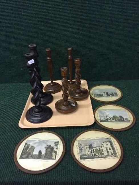 A tray of three pairs of wooden candlesticks and four hand coloured engravings
