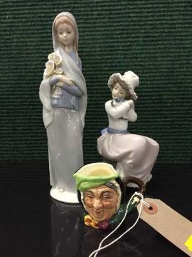 A Lladro figure of a girl, a Nao figure of a girl and a miniature Royal Doulton character jug - Sairey Gamp
