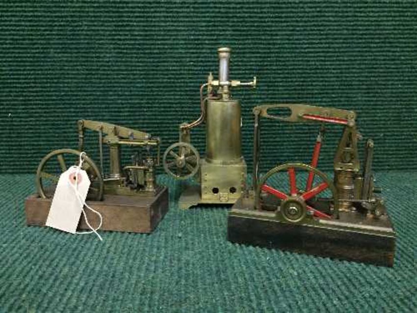 Two miniature live steam piston engines and a boiler