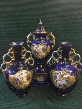 A late 19th century three piece decorative blue and gilt vase set with classical decoration