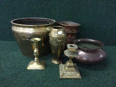A tray of brass candlesticks, beaten copper bowl, heavy brass planter etc