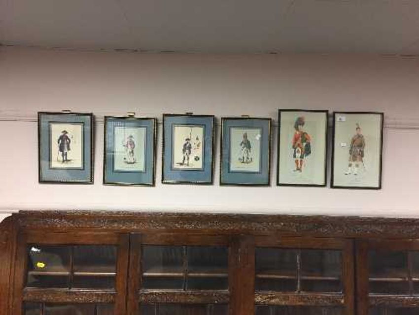 Six framed military colour prints depicting soldiers of various regiments. (6)