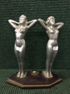 A cast metal Art Deco style ornament depicting pair of nude females on plinth