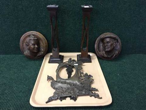 A pair of Art and Crafts candlesticks, carved wooden wall plaques, metal photo frame in the form of a galleon
