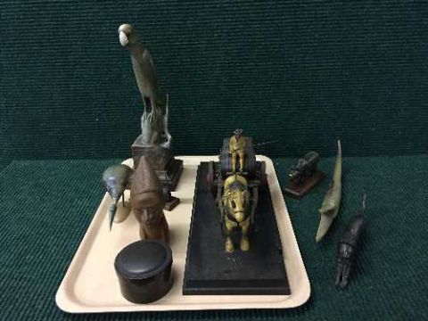 A tray of tribal bust, Whitbread dray horse and carriage, carved horn animal ornaments