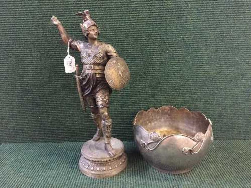 A metal figure of a Roman warrior and an Art Nouveau style planter
