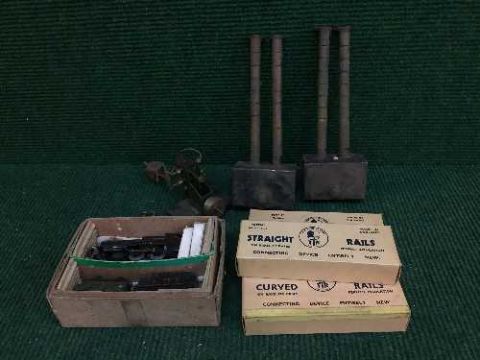 A box of steam engine components, carriage, track etc