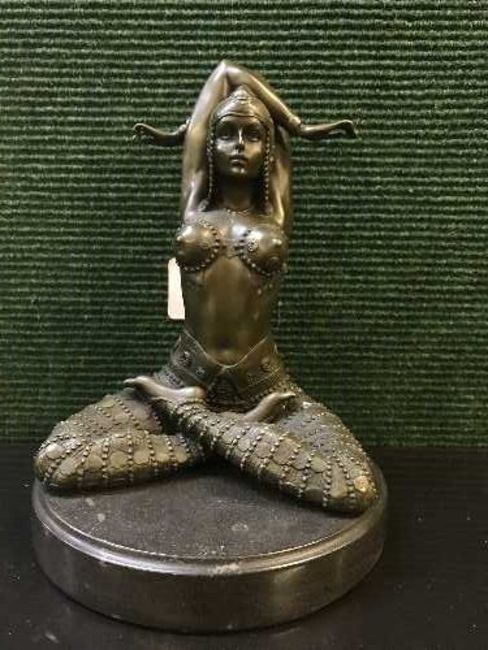 A bronze figure on stone base : Eastern dancer with legs crossed.