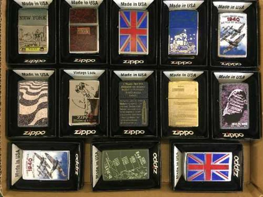 A tray of thirteen Zippo lighters