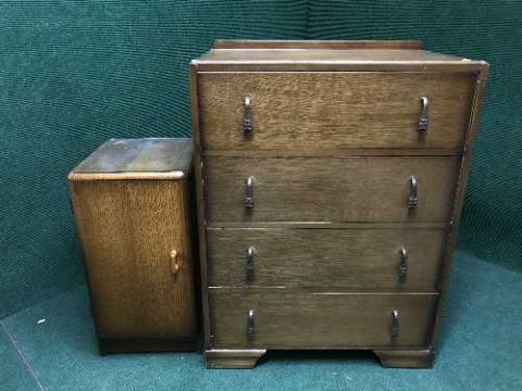 An oak four drawer chest and a bedside cabinet