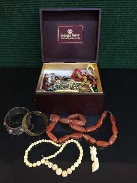 A box of beaded and costume jewellery - necklaces, brooches, bangles and pins