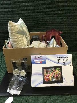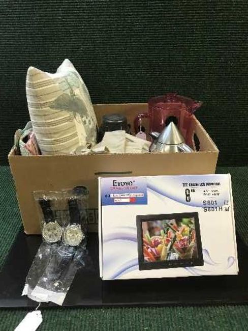 Two Playboy jumbo-sized wrist watches (brand new), an 8" monito (brand new), together with a quantity of table linen, a butterfly cushion, bowls, water jug, etc. (Q)