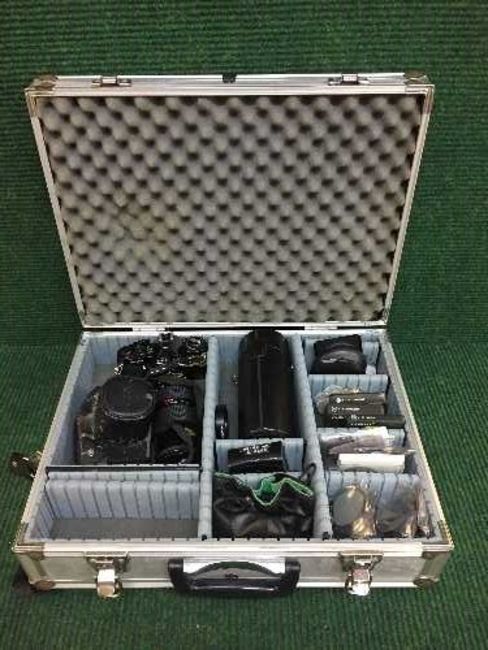 An aluminium case and box containing cameras, Pentax MV1 camera, filters, polaroid cameras etc