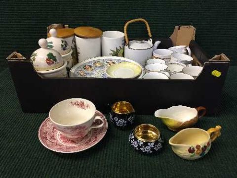 Two boxes of china tea set, Art deco style tea set, Crown Devon storage jars, commemorative mugs etc
