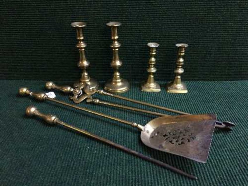 A three piece brass companion set together with two pairs of brass candleticks
