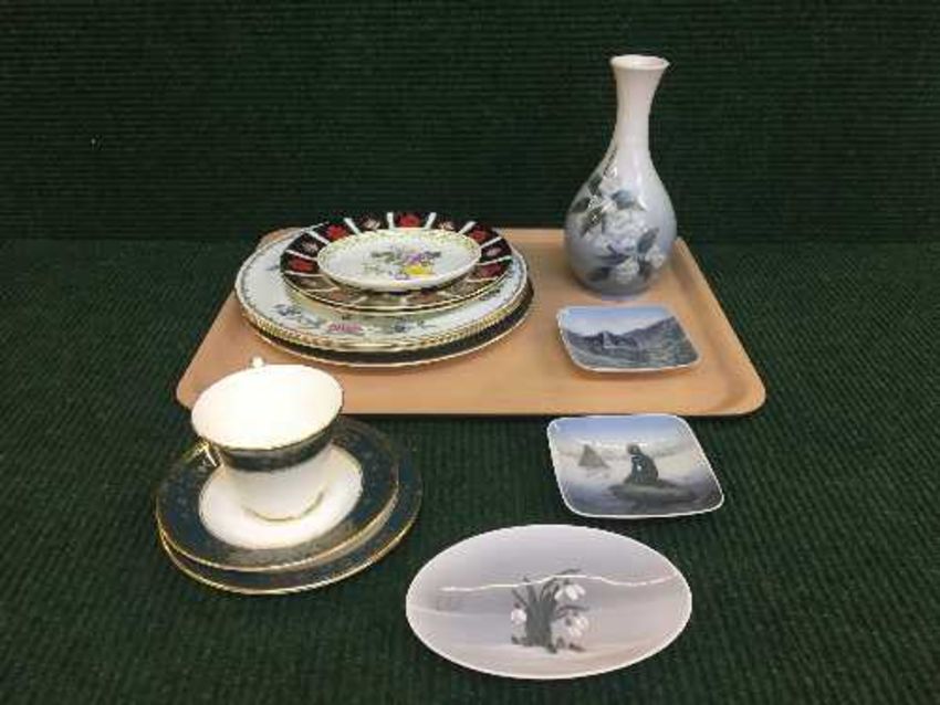 A tray of Royal Doulton Carlyle china trio, shallow dish, pair of Royal Crown Derby plates, pair of Aynsley Pembroke plates, Royal Copenhagen vase and dishes etc