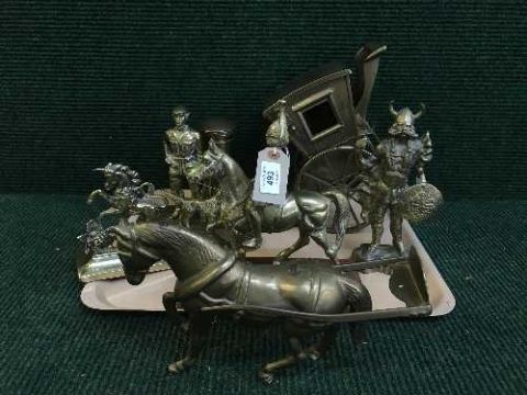 A tray of heavy brass figures - Queens Guard, horse and carriage, post box etc