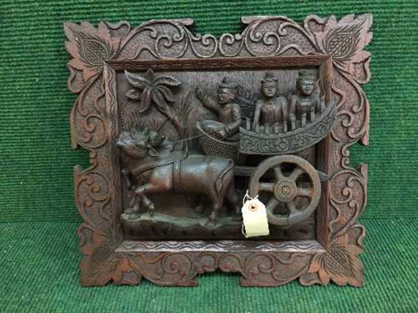 A heavily carved Eastern wall panel depicting three figures on a cart