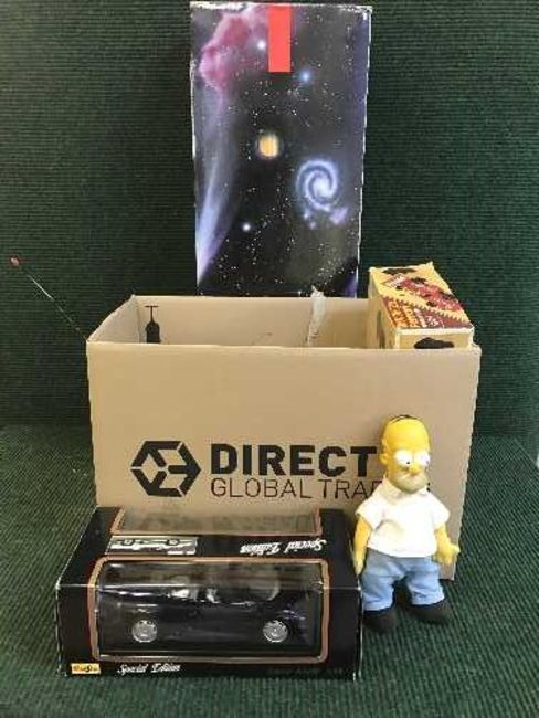 Two boxes of assorted soft toys, TY Beany Babies, boxed Maisto Jaguar die cast car, Tasco telescope