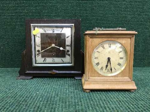 An oak cased Art Deco mantel clock and a pine cased mantel clock