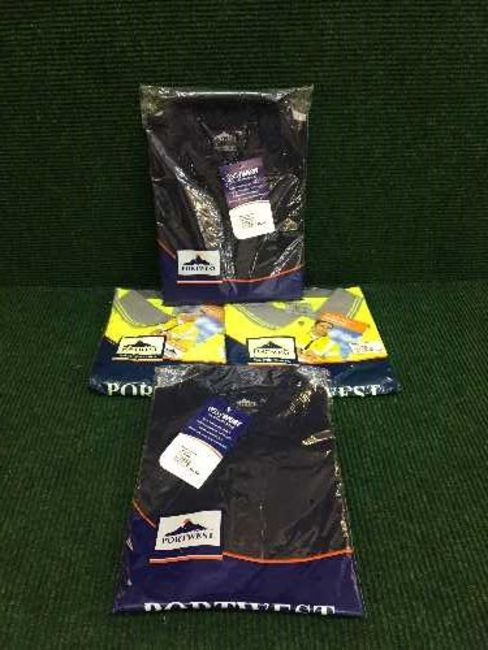 Three boxes of industrial high viz waders, jackets, overalls etc