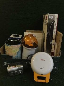 A box of LG Blu ray player and remote, cam-corder, kitchen electricals, flood light etc
